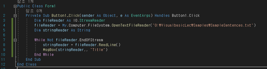 이번 시간엔 비주얼베이직에서 파일을 삭제하는 방법에 대해 알아보겠습니다. 예시 코드입니다. 중요 메서드는 My.Computer.FileSystem의 DeleteFile메서드입니다. 삭제를 원하는 경로를 인자로 전달하면 됩니다. 바로 시작해보겠습니다. 1. 우선 샘플파일을 만들어주고요, test1.txt 를 만들었습니다. 2. 버튼 하나 있는 폼을 만들어주시면 됩니다. 3. 그리고 예제코드와 같이 입력하신 후 실행해보시면 DeleteFile의 메서드로 입력하신 경로의 파일이 삭제되는걸 보실 수 있습니다.