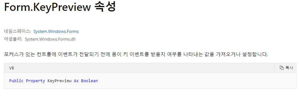 핵심: WindowsForms에서 키 입력 처리가 안될 땐, KeyPreview 속성의 값을 확인해보자! #참고 docs.microsoft.com/ko-kr/dotnet/api/system.windows.forms.form.keypreview?view=net-5.0 어제 비주얼베이직으로 게임을 만드는데, 멀쩡하게 잘 작성한 키 입력 코드가 먹통이었습니다... KeyDown, KeyPress 등 키 입력들이 전부 작동이 안됐습니다. 그래서 열심히 검색해봤더니 바로바로 !!! 윈도우폼즈에서는 폼에서 입력 처리할 때 Me.KeyPreview = True 바로 요 프리뷰 오브젝트를 트루! 해줘야 키 입력들이 된다고 합니다. =================================================..