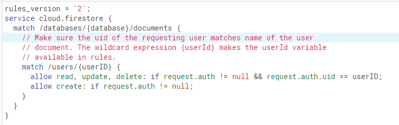 위 규칙은 일반적인 인증 패턴으로 사용자가 자신의 데이터만 읽고 쓸 수 있도록 허용하는 방식입니다. match /users/{userID} { allow read, update, delete: if request.auth != null && request.auth.uid == userID; allow create: if request.auth != null; } 이 부분이 중요한데 우선 첫 번째 줄의 {userID} 는 와일드카드로, /user/ 컬렉션 아래에 존재하는 다큐먼트들을 뜻합니다. 두 번째 줄의 allow는 if문의 조건이 만족될 경우 허용할 내용을 나타냅니다. 두 번째 줄에서는 if문의 조건이 만족하는 사용자에게 /users/{userID}다큐먼트를 read, update, delete할 권..