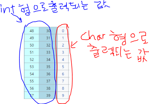 위 그림은 아스키 코드표의 일부분을 캡쳐한 것인데, 각 문자를 int형으로 바꾸게 되면 왼편의 파란 원에 있는 숫자들로 바뀌어 출력되게 된다.